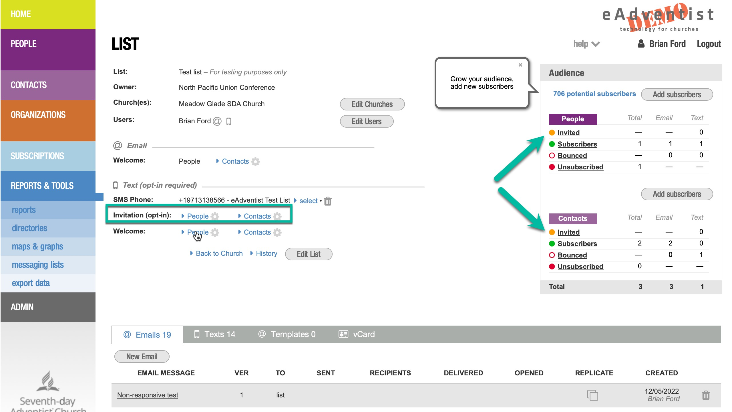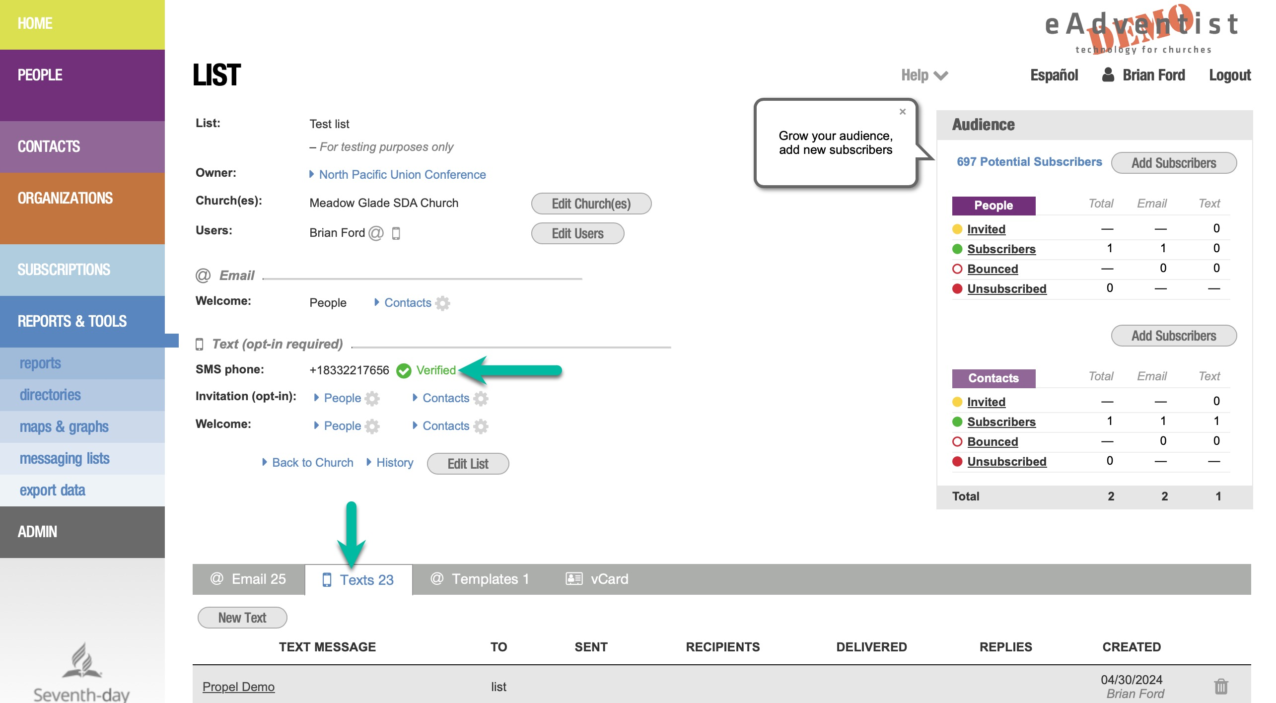 Tan pronto como tu número SMS gratuito esté verificado, enviaremos una Invitación a cada uno de tus Suscriptores existentes. Una vez que respondan SÍ, podrás enviarles mensajes de texto. eAdventist enviará automáticamente Invitaciones a cualquier nuevo Suscriptor que añadas.