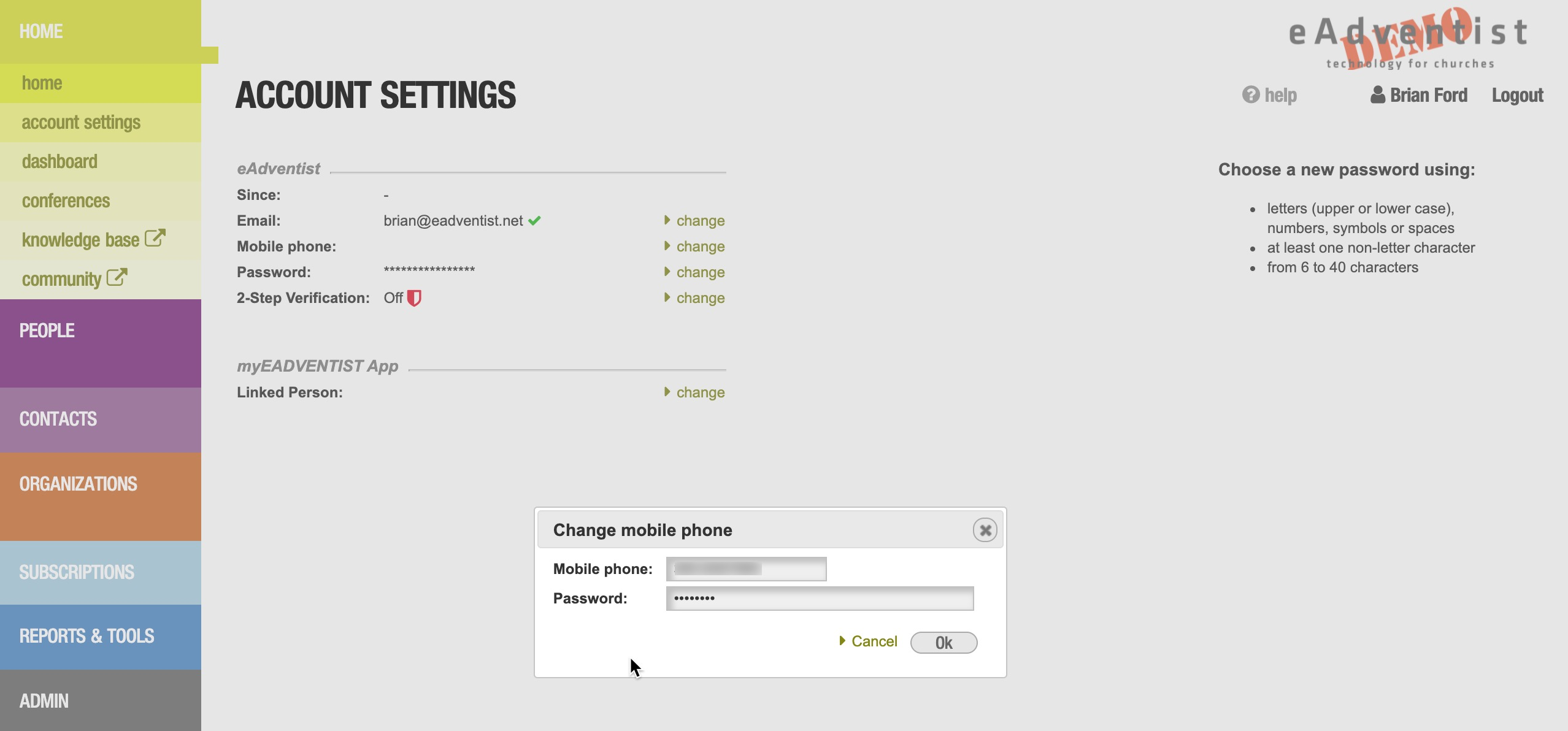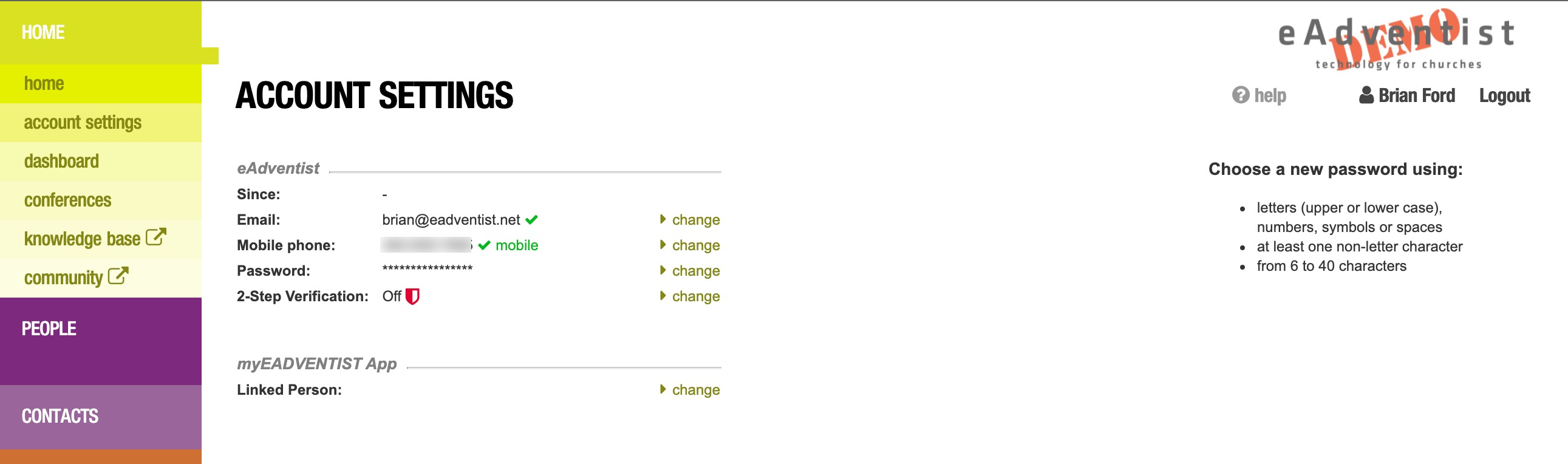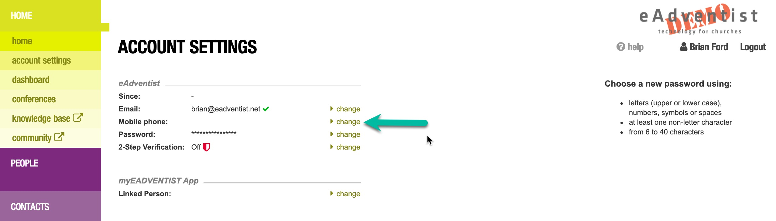 Utiliza la opción de menú "configuración de la cuenta" (en la sección de menú Inicio) para agregar tu "Teléfono móvil" a tu cuenta de eAdventist. Haz clic en el enlace "cambiar".