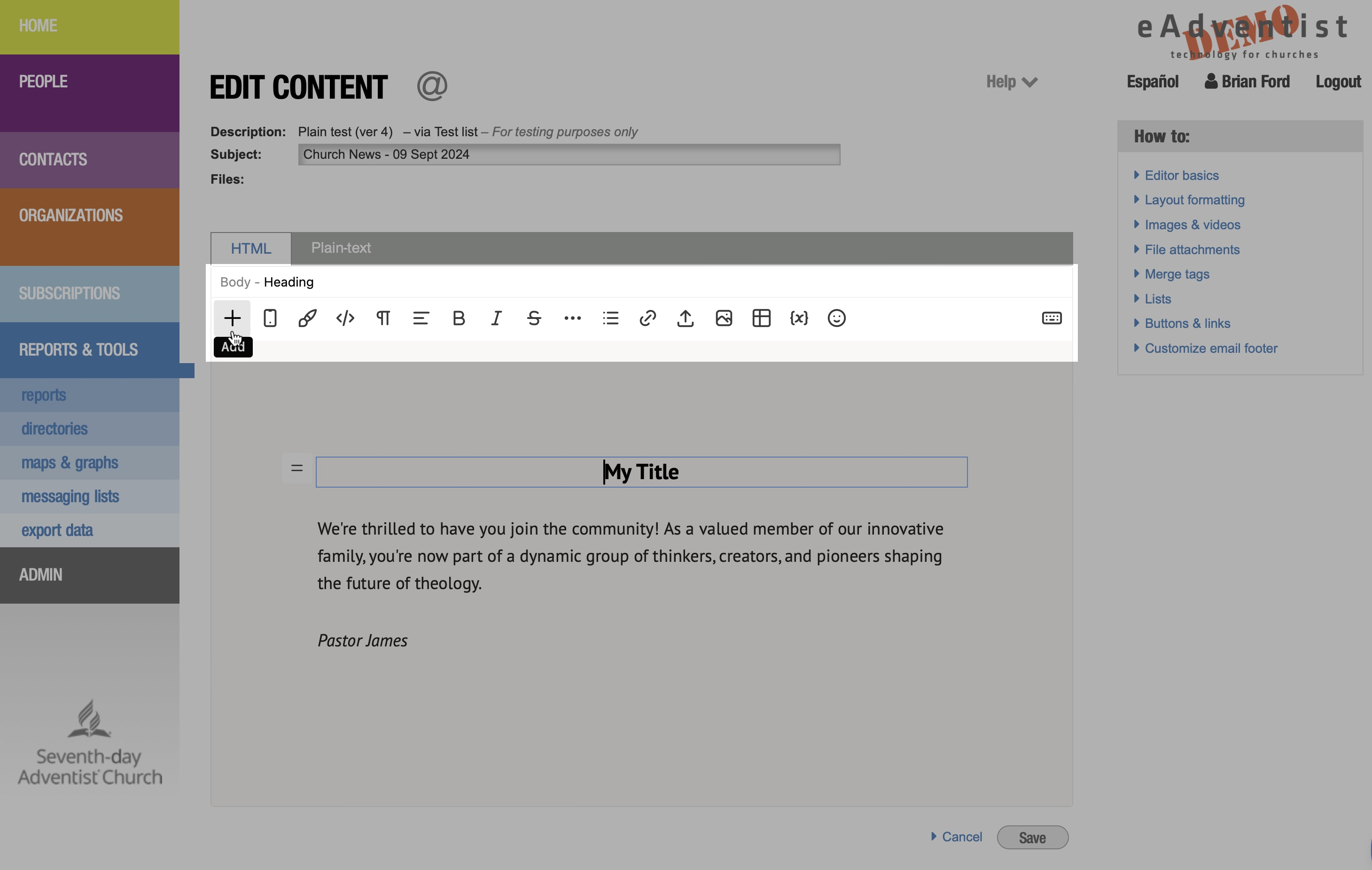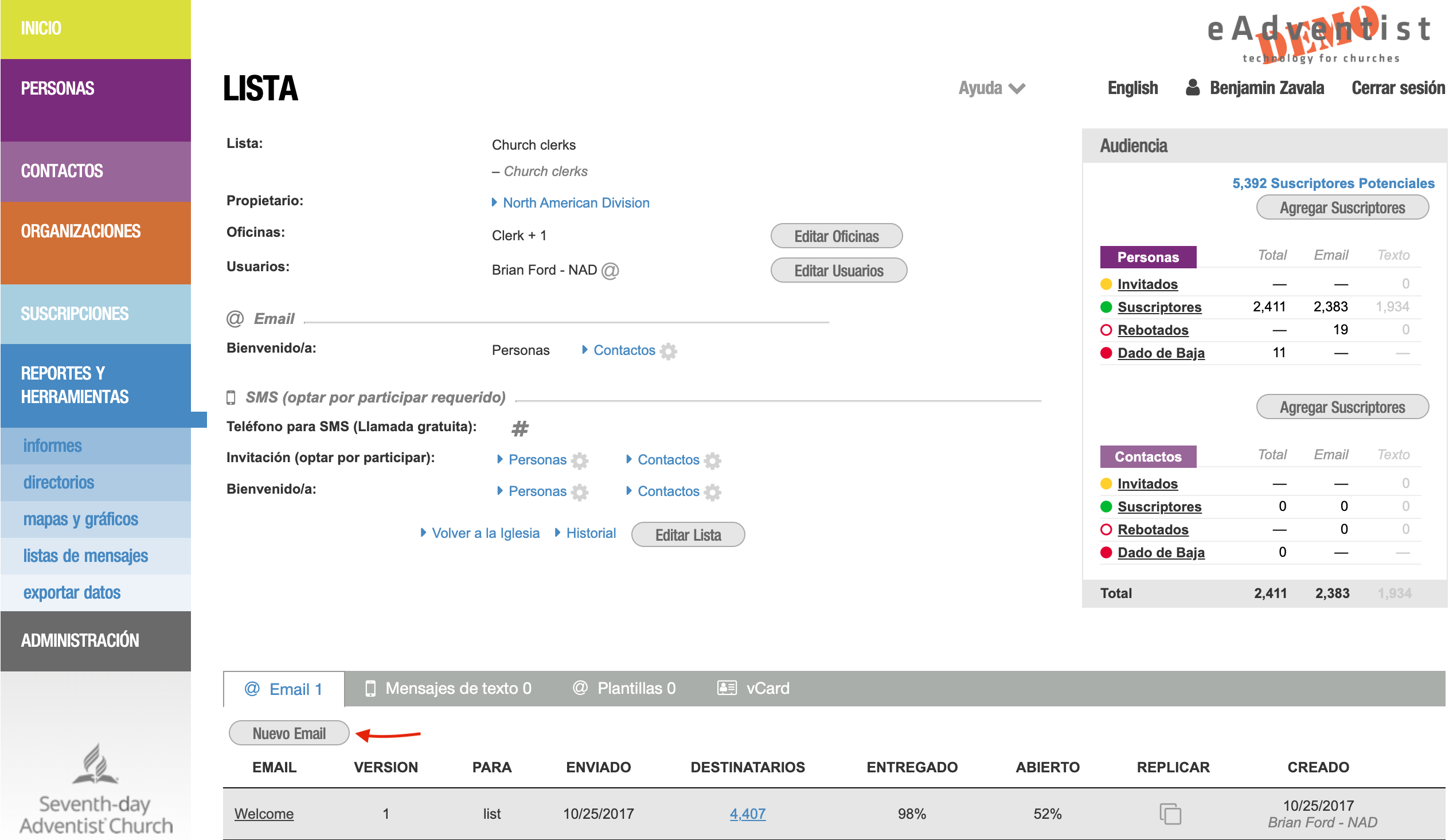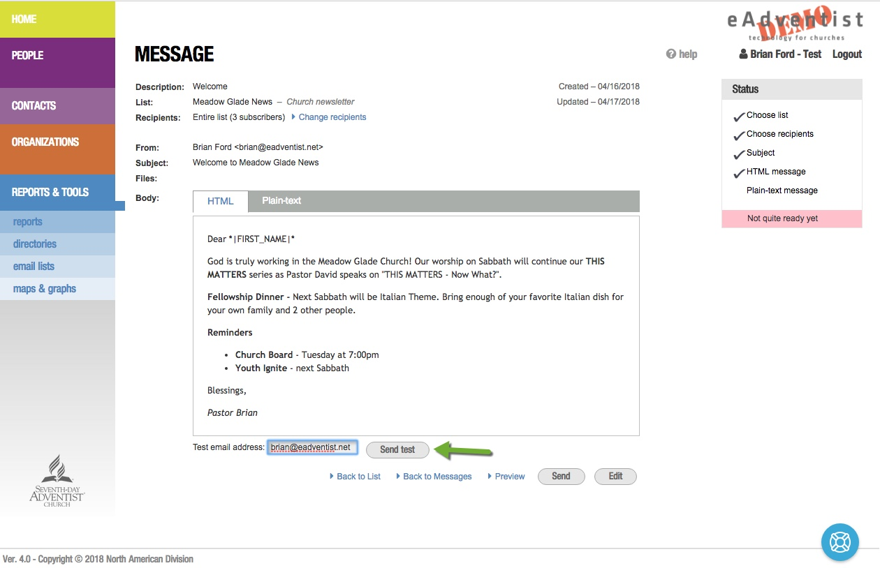 Cuando estés listo, haz clic en el botón "Enviar" y tu mensaje se pondrá en cola para su entrega. eAdventist hará un seguimiento de cada persona que lo reciba y lo abra, así como de los mensajes que "reboten".