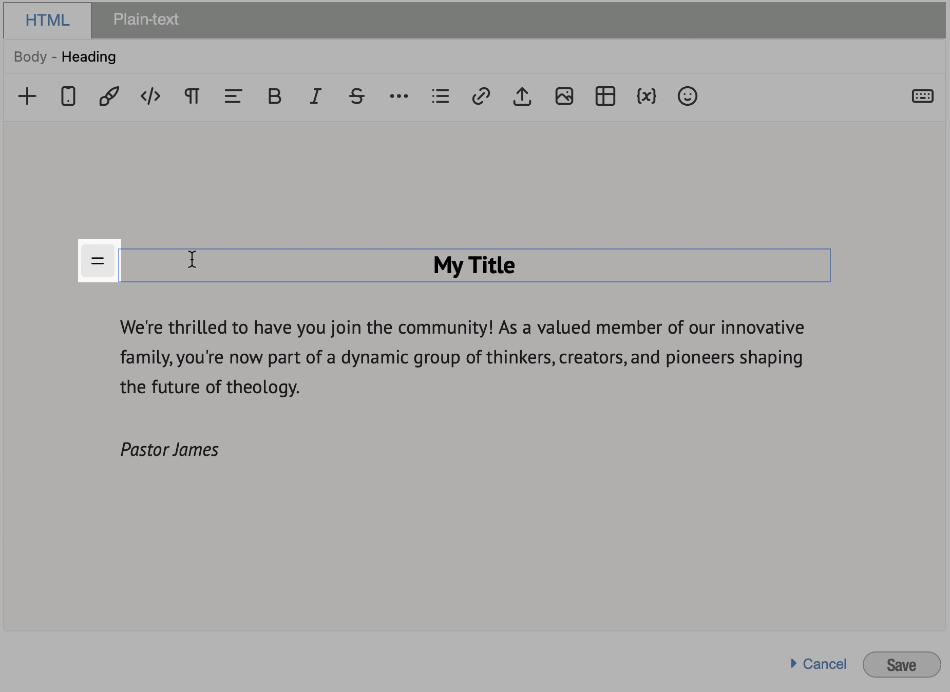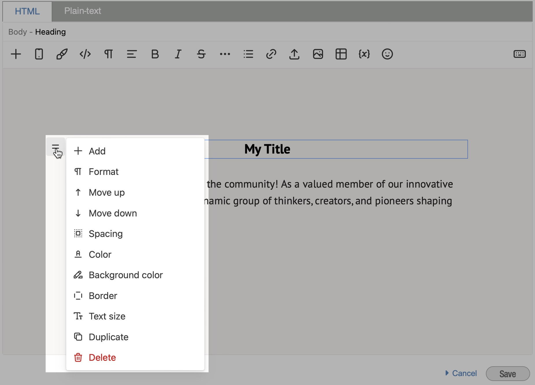 El editor de correos electrónicos usa bloques (por ejemplo, texto, imagen, encabezado, lista) para construir y personalizar tu mensaje. La barra de herramientas principal siempre se muestra en la parte superior del editor.