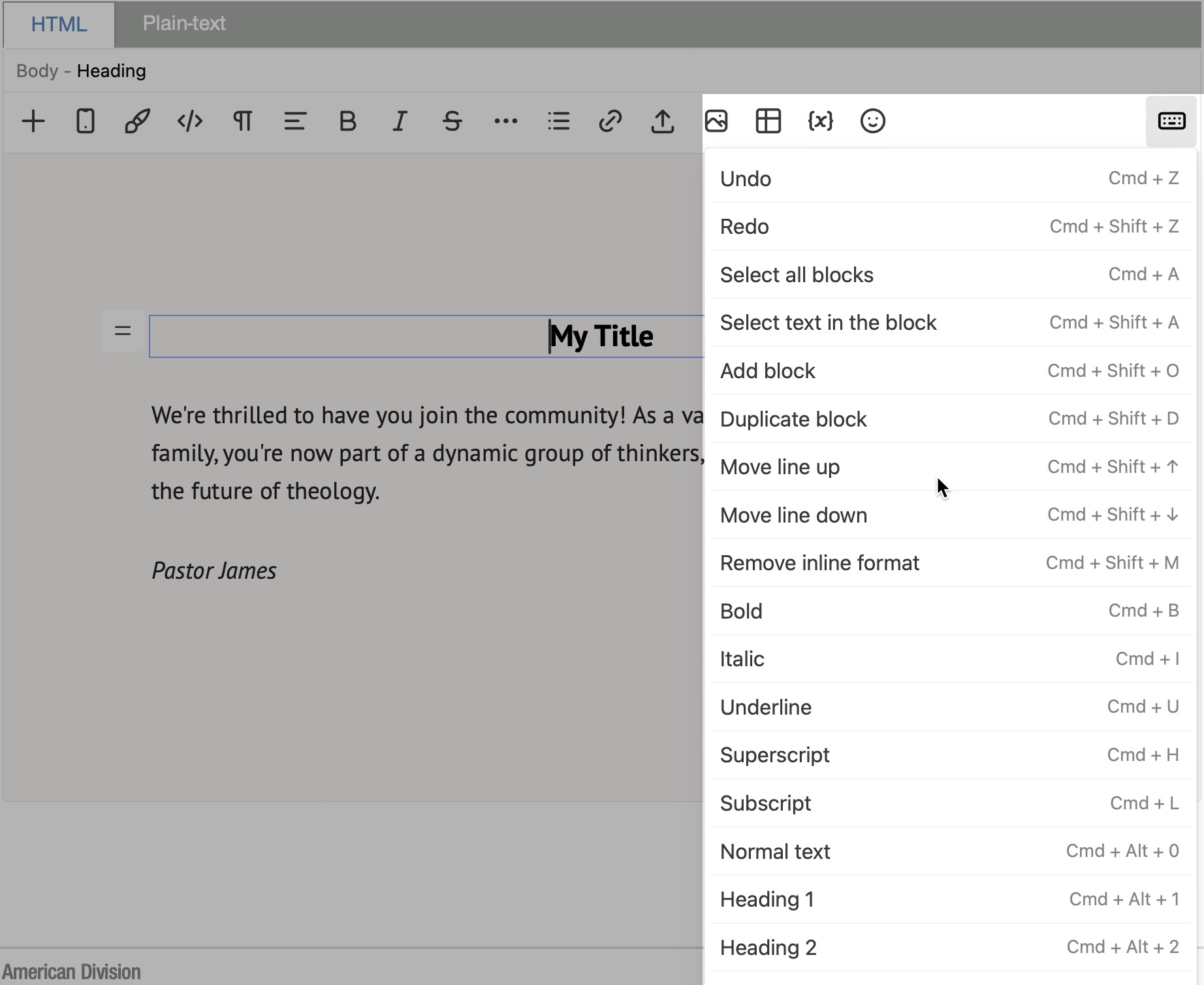Usa el botón del bloque para arrastrarlo hacia arriba o hacia abajo en el mensaje. Haz clic en el botón del bloque para ver el menú del bloque.