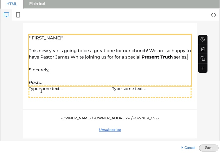 Usa campos de combinación, como "|FIRST_NAME|" en el ejemplo, para personalizar tu mensaje para cada destinatario.Haz clic en el botón "Guardar" para editar otras configuraciones del mensaje y enviarlo.