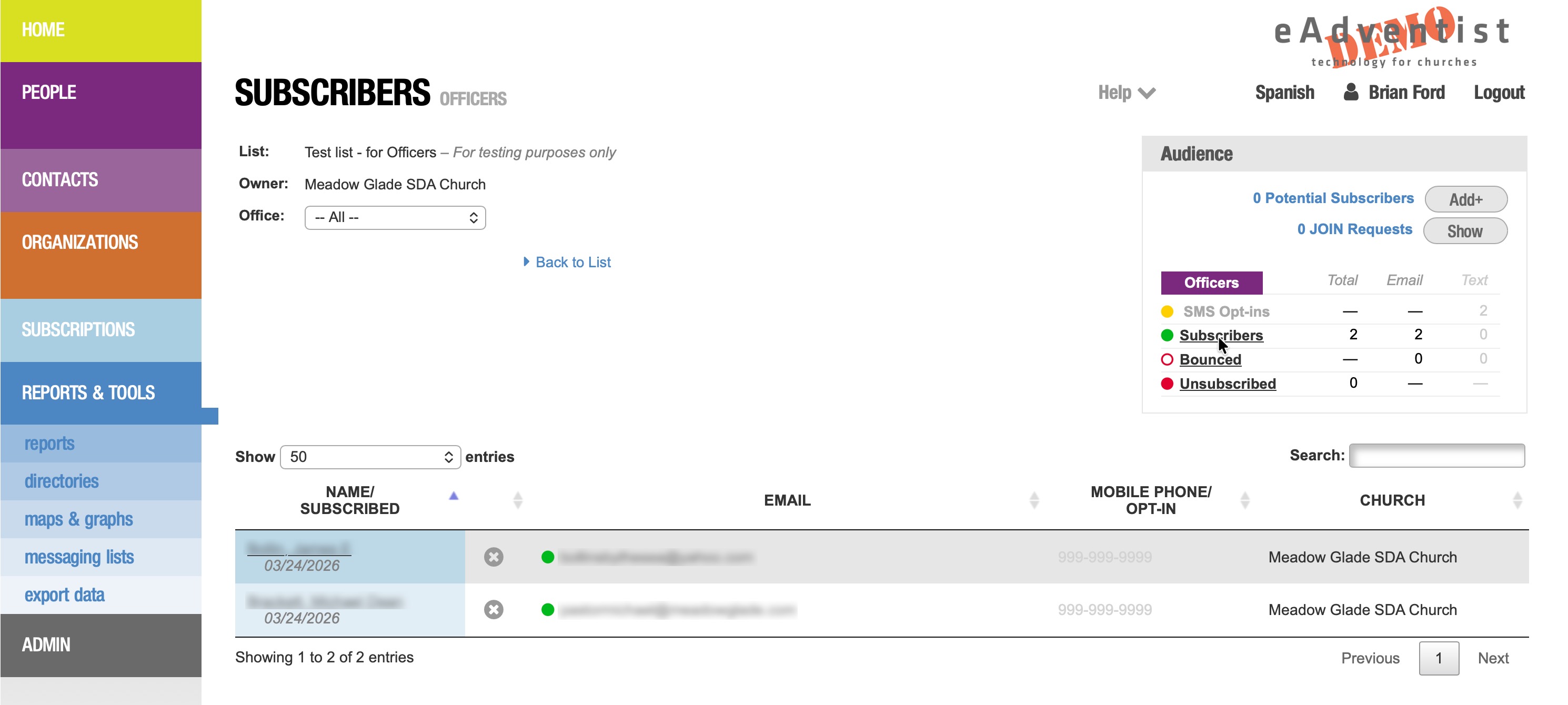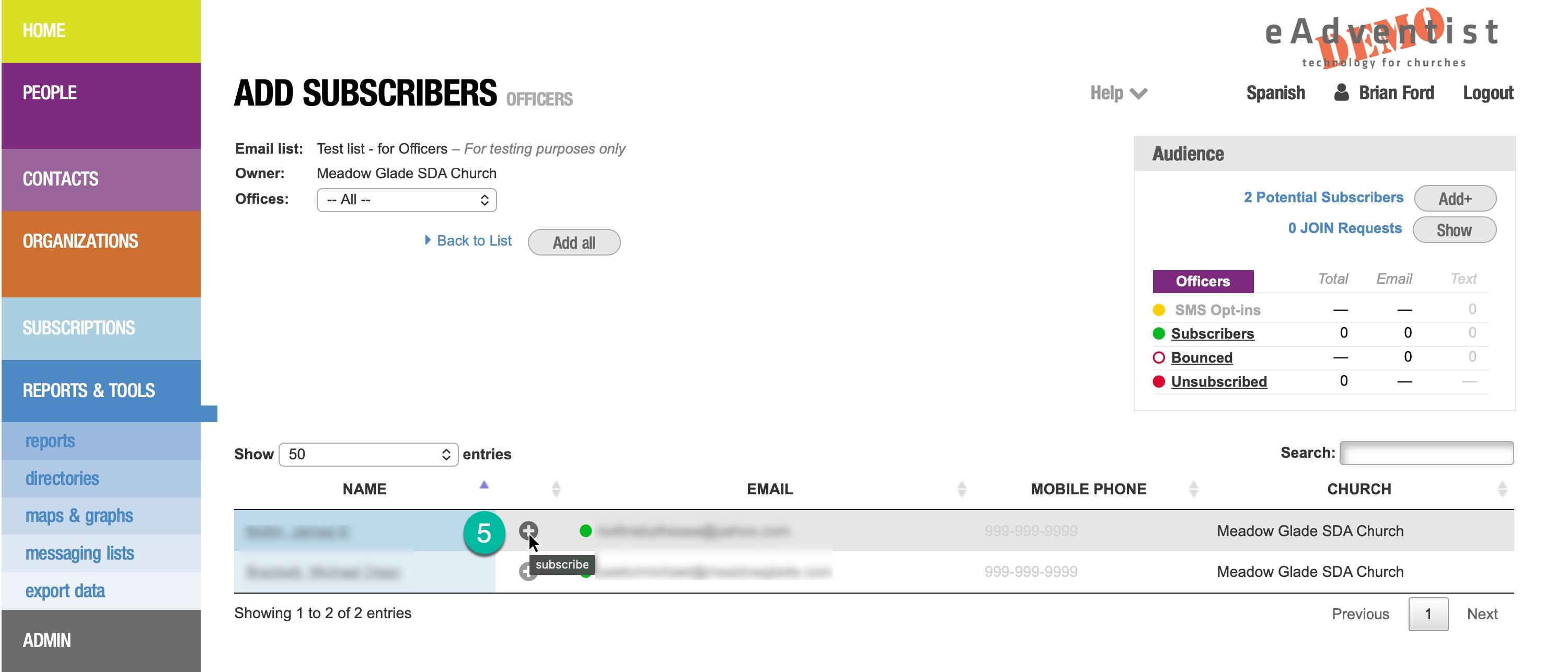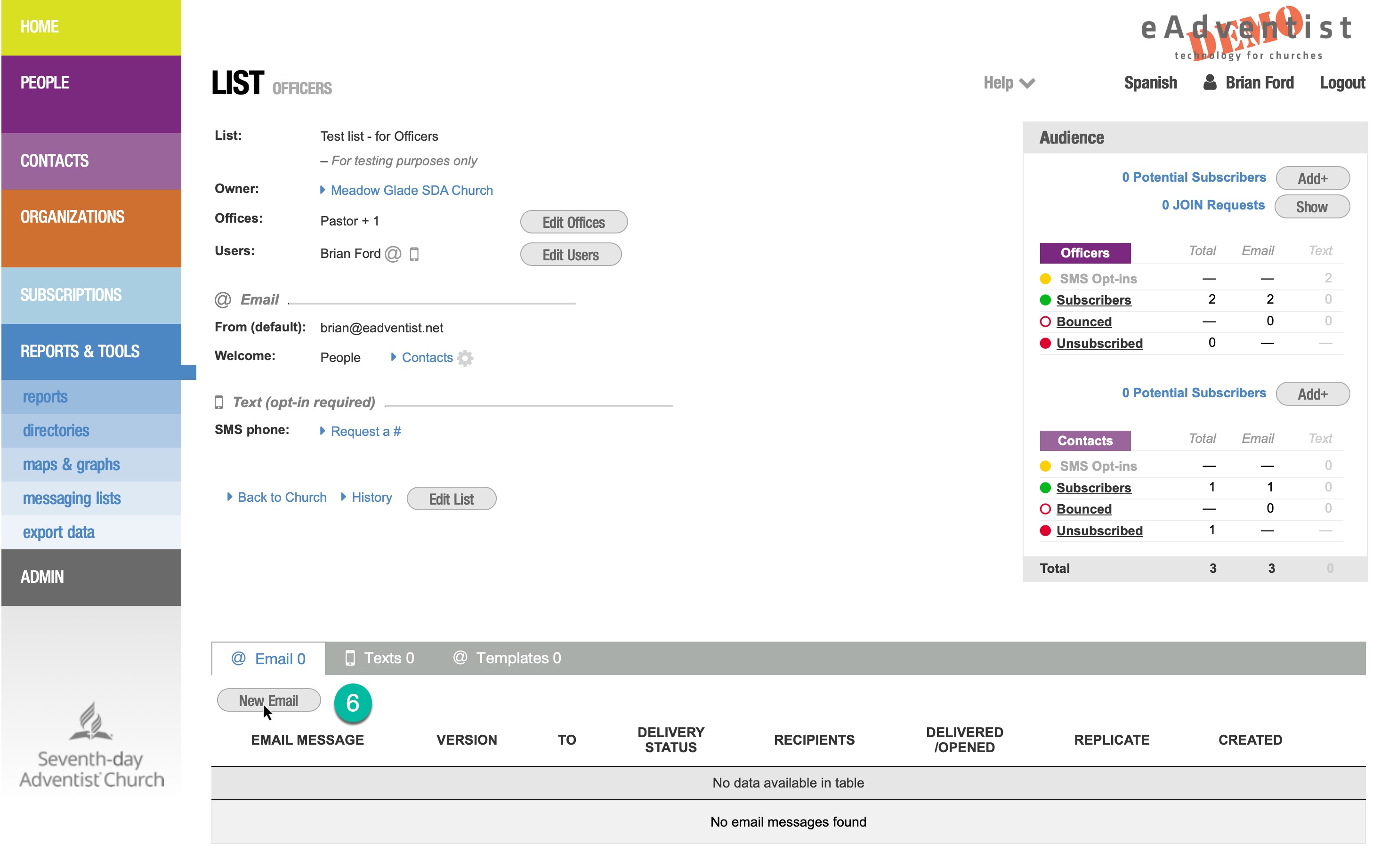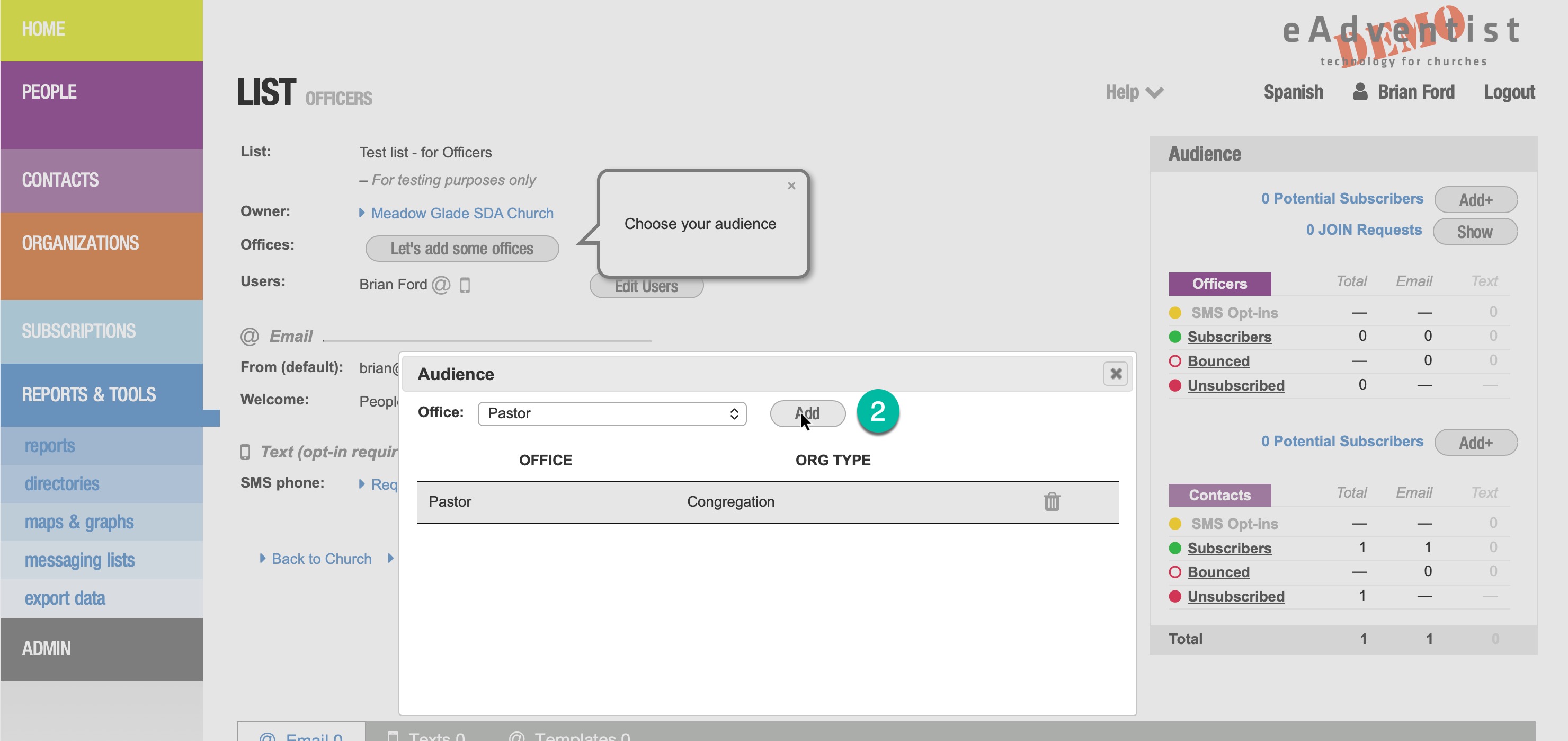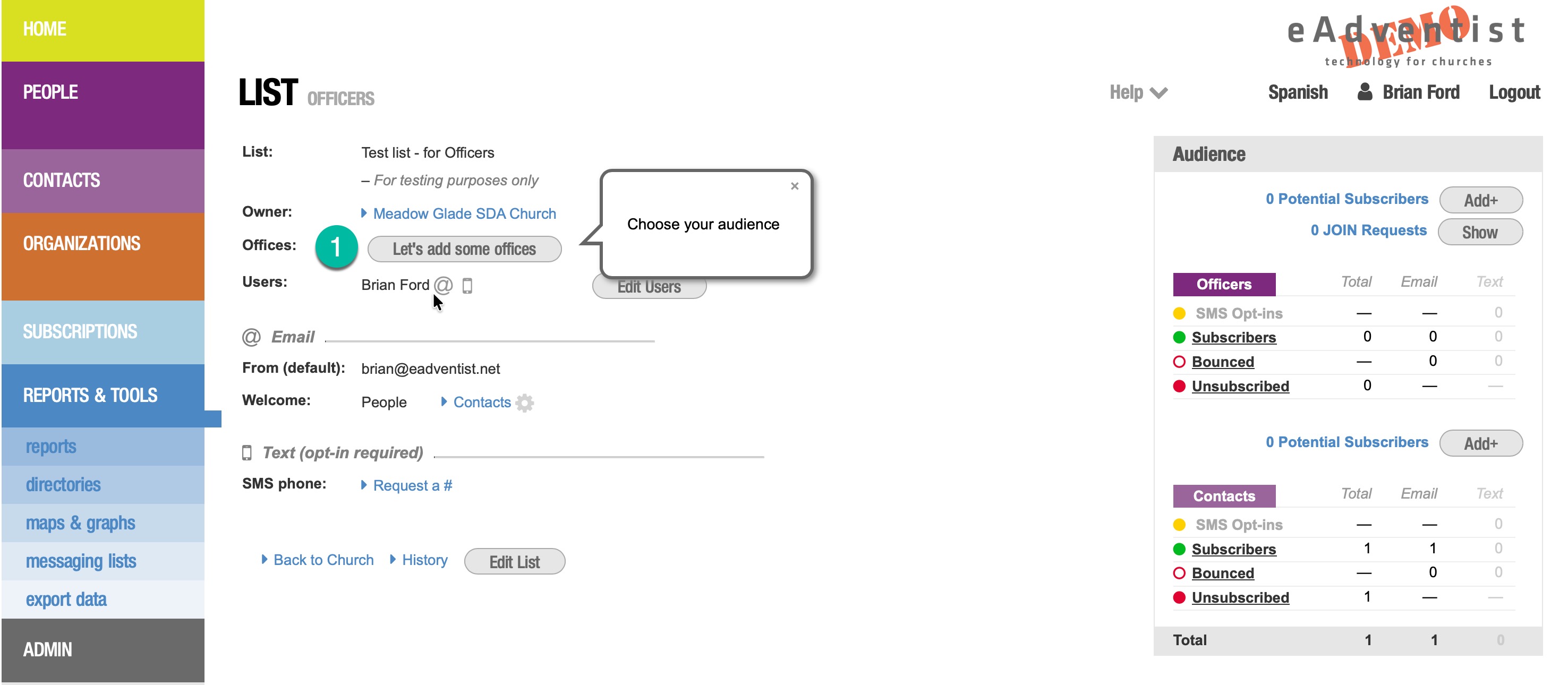 En la página de la lista de mensajería, el cuadro “Audiencia” muestra quiénes están en su lista. Puede agregar suscriptores desde las secciones de Organizaciones (donde aparecen los oficiales) y Contactos de eAdventist.